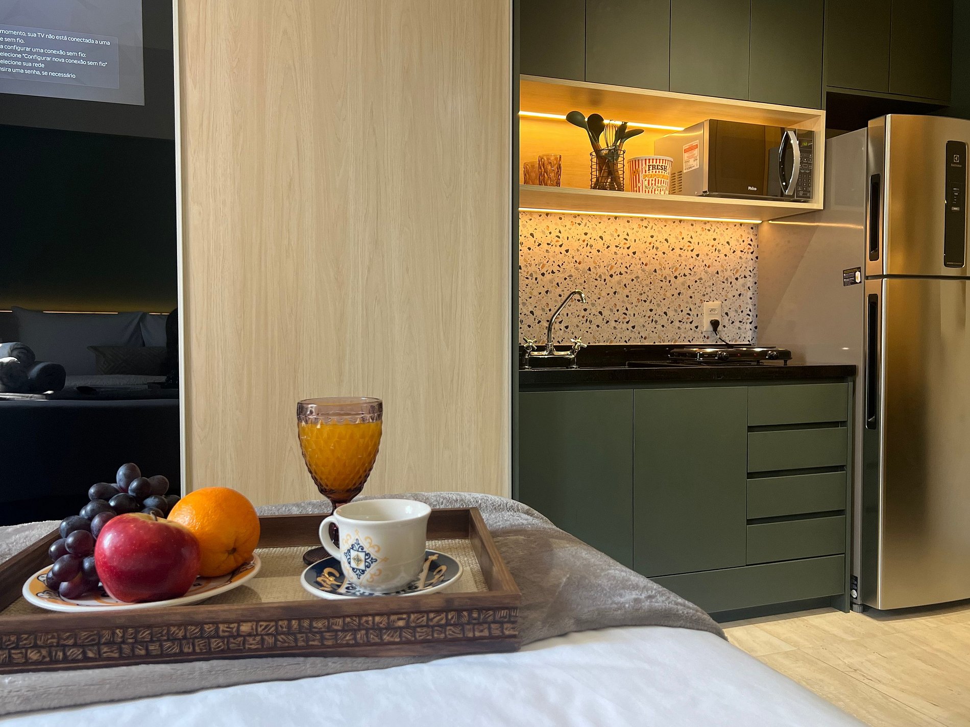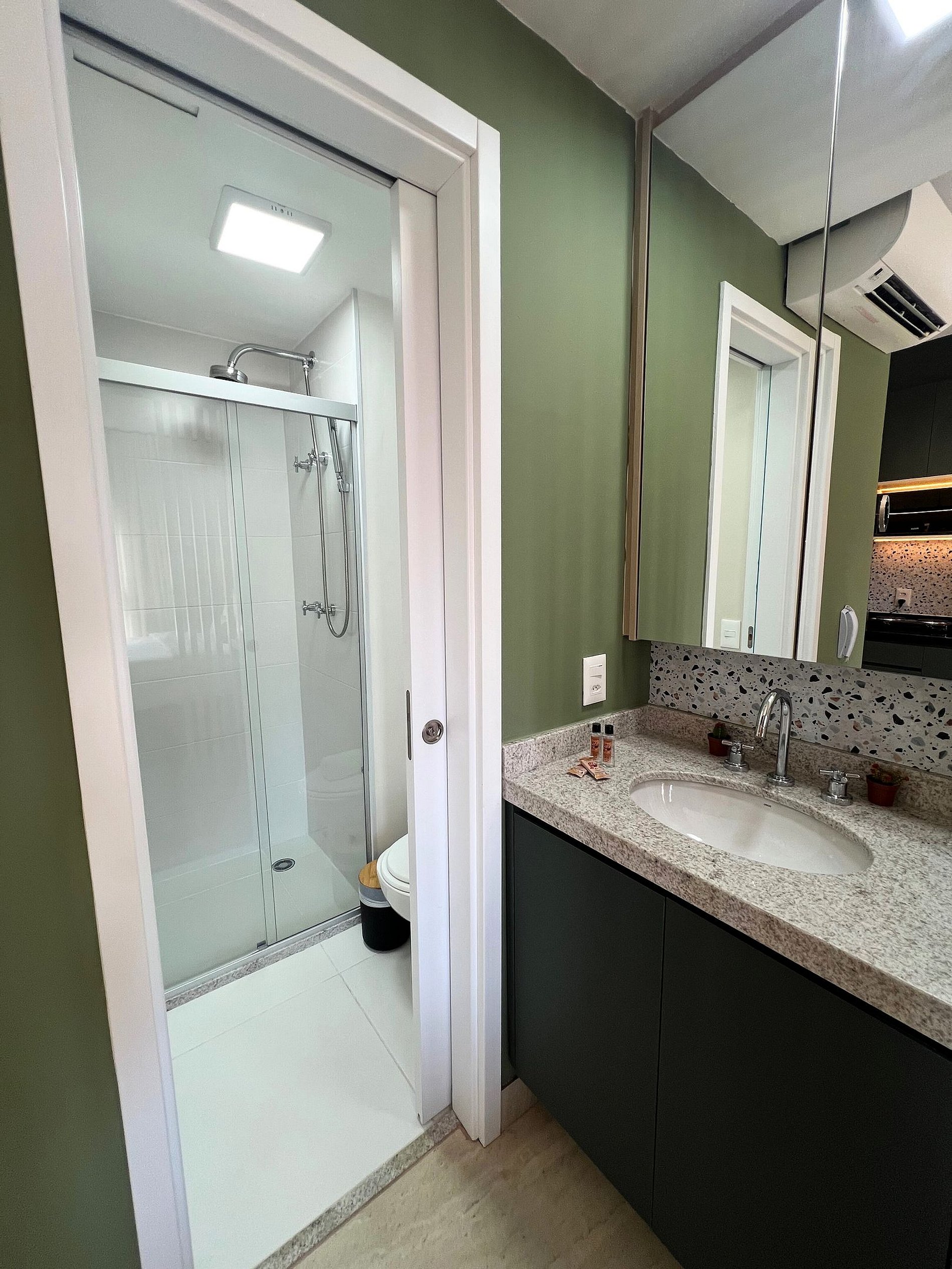 Os hóspedes têm acesso exclusivo ao studio, incluindo cozinha, área de estar e banheiro, garantindo privacidade total.