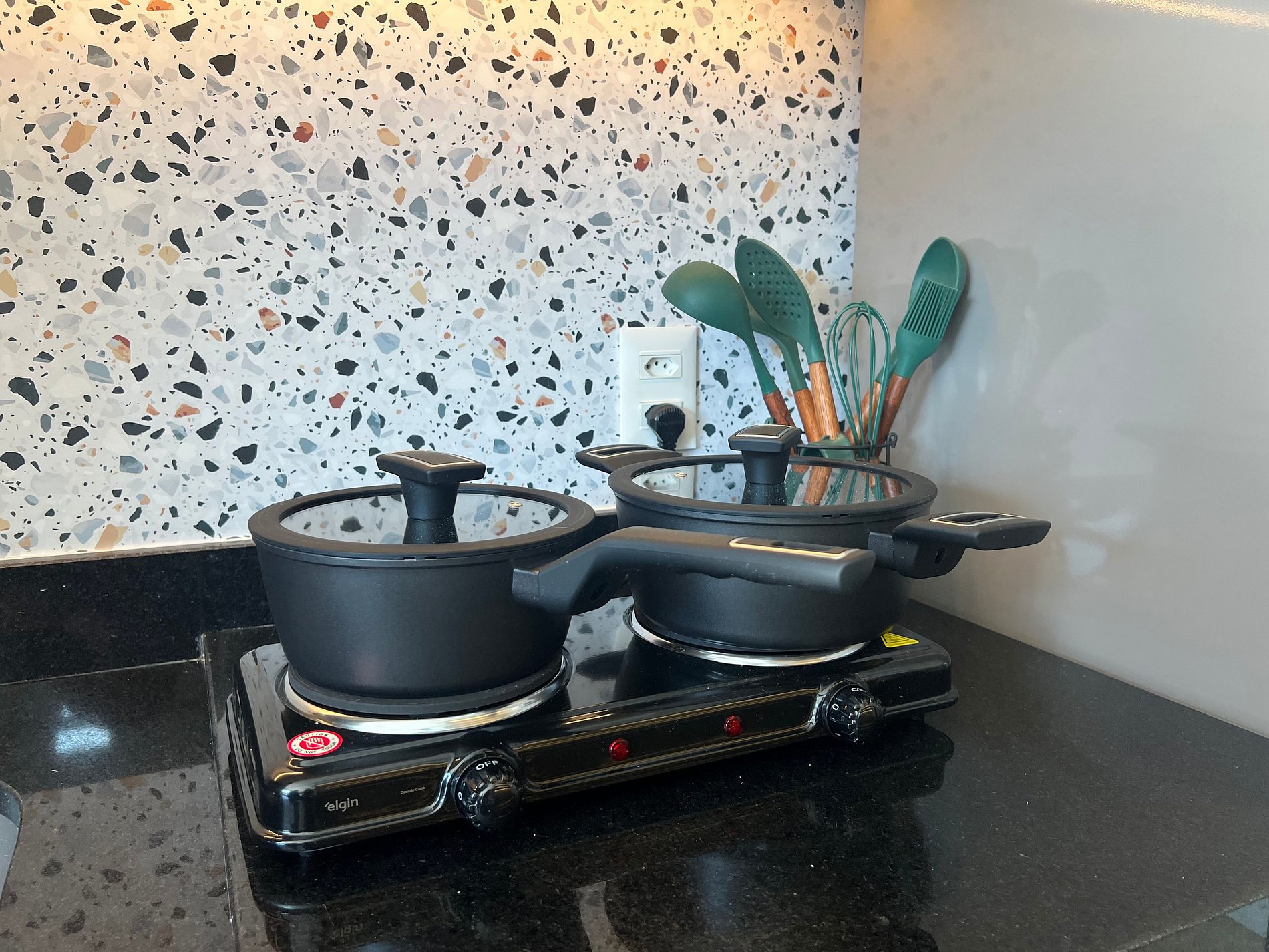 Cozinha completa: cooktop, micro-ondas, cafeteira, utensílios e pratos para preparar suas refeições com praticidade.