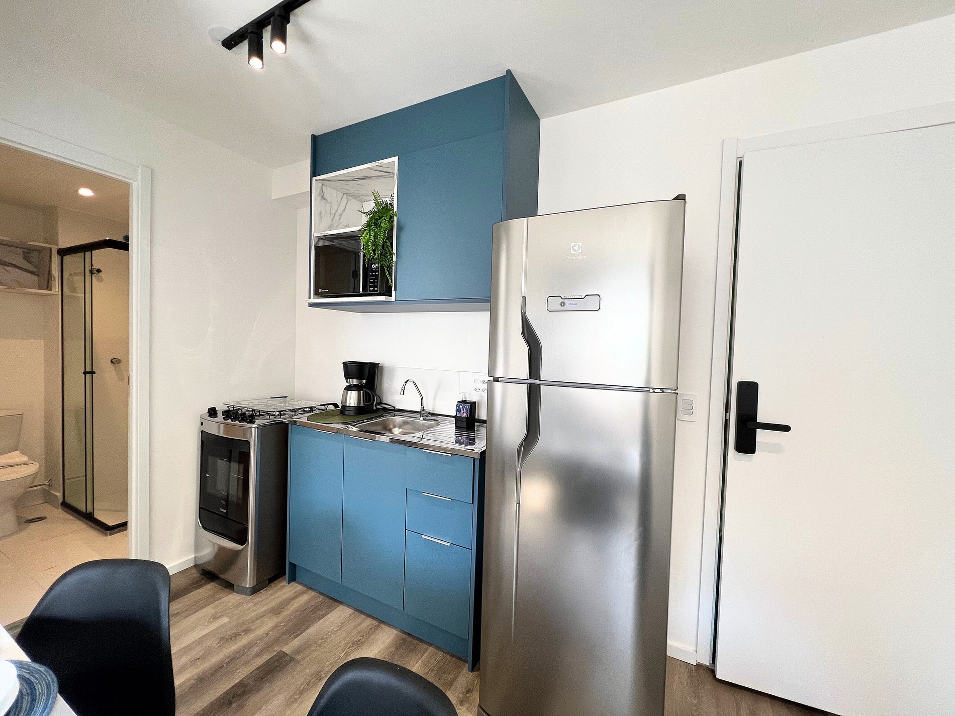 Nosso studio combina praticidade e conforto em um só lugar. Localizado ao lado do Metrô República, oferece fácil acesso a toda São Paulo. O espaço é moderno e bem equipado, com cama de casal confortável, cozinha compacta completa, Wi-Fi rápido e Smart TV. O chuveiro de alta pressão garante um banho relaxante após um dia intenso na cidade. Além disso, o prédio conta com piscina, academia e lavanderia, trazendo ainda mais comodidade para sua estadia.
