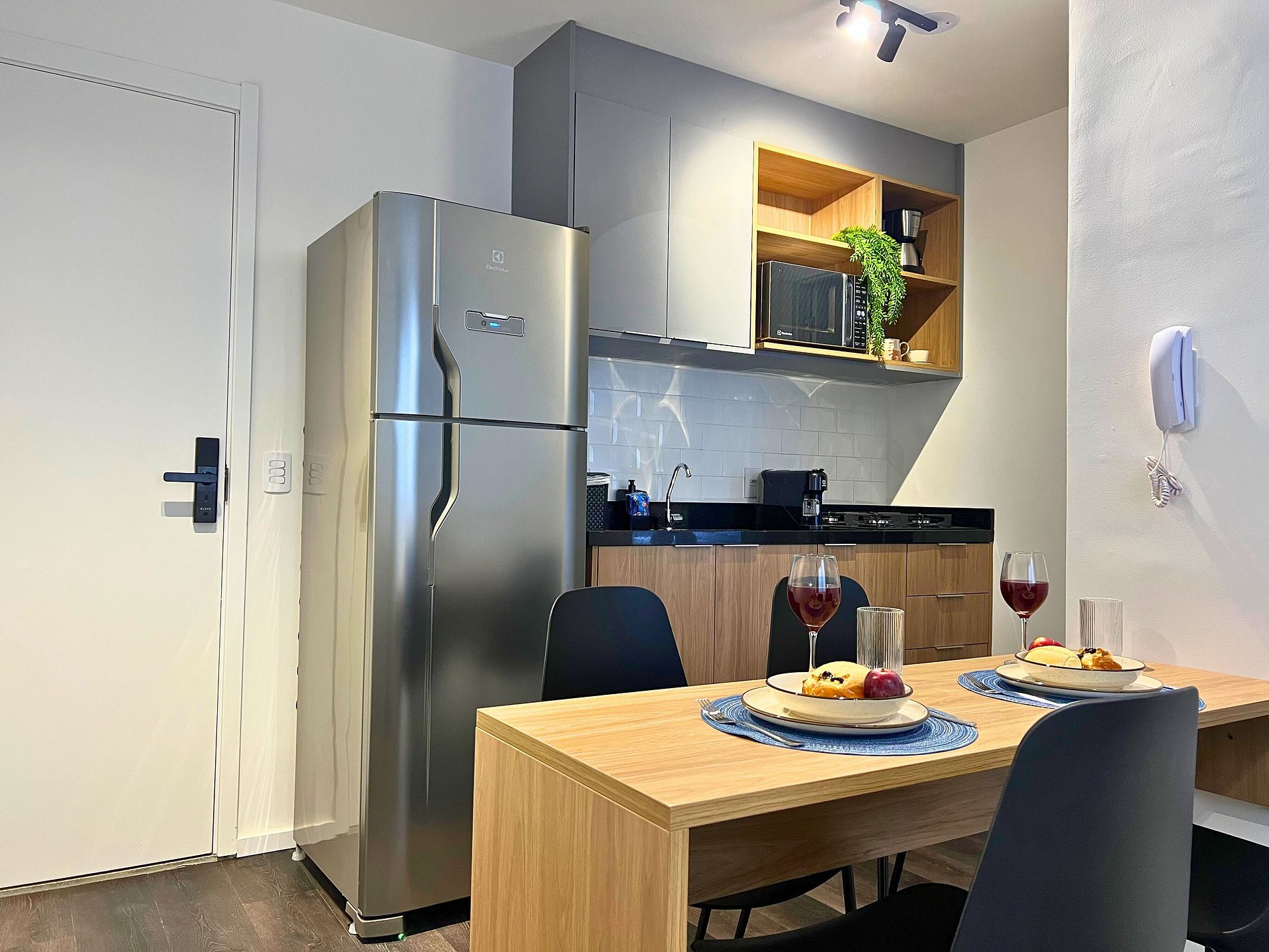 Nosso studio combina praticidade e conforto em um só lugar. Localizado ao lado do Metrô República, oferece fácil acesso a toda São Paulo. O espaço é moderno e bem equipado, com cama de casal confortável, cozinha compacta completa, Wi-Fi rápido e Smart TV. O chuveiro de alta pressão garante um banho relaxante após um dia intenso na cidade. Além disso, o prédio conta com piscina, academia e lavanderia, trazendo ainda mais comodidade para sua estadia.