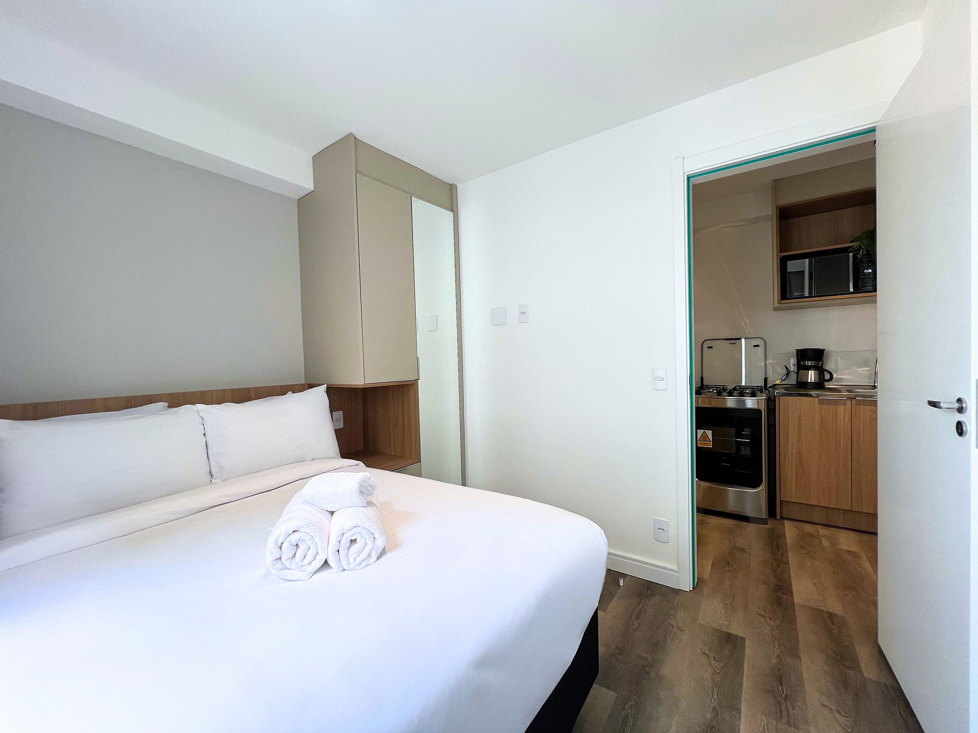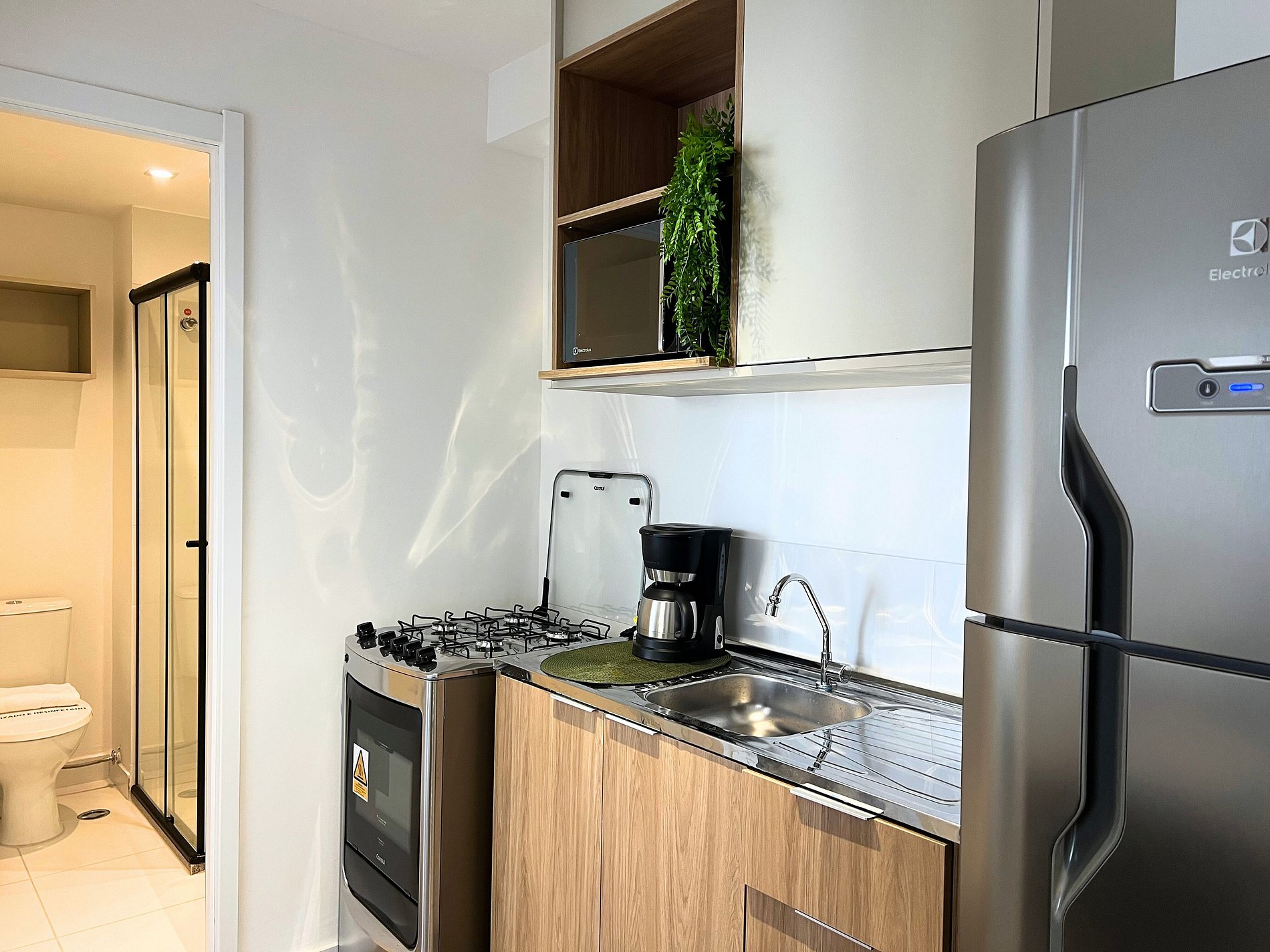 Nosso studio combina praticidade e conforto em um só lugar. Localizado ao lado do Metrô República, oferece fácil acesso a toda São Paulo. O espaço é moderno e bem equipado, com cama de casal confortável, sofá-cama funcional, cozinha compacta completa, Wi-Fi rápido e Smart TV. O chuveiro de alta pressão garante um banho relaxante após um dia intenso na cidade. Além disso, o prédio conta com piscina, academia e lavanderia, trazendo ainda mais comodidade para sua estadia.