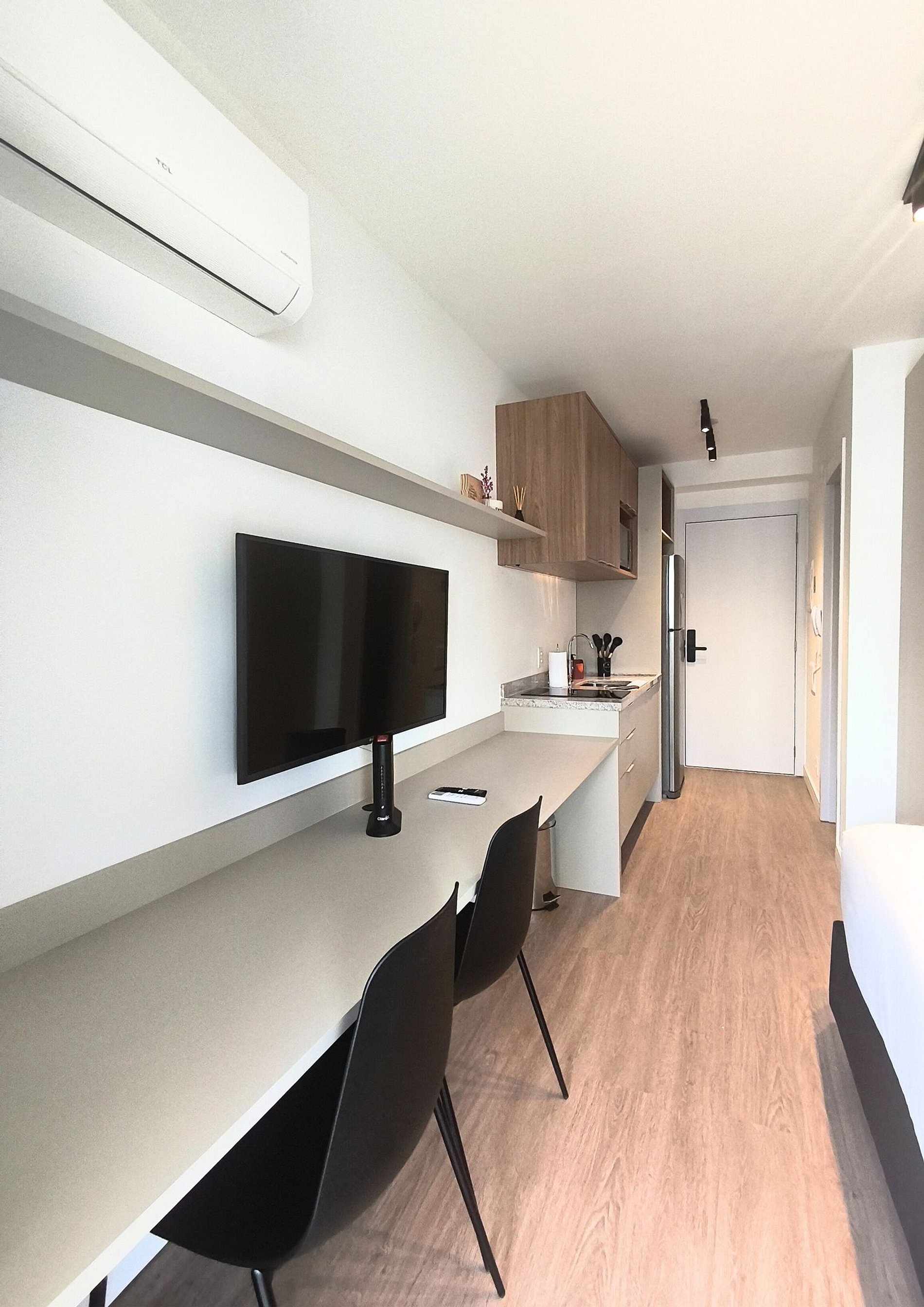 O espaço foi pensado para proporcionar uma estadia completa com decoração contemporânea, Wi-Fi de alta velocidade, cozinha equipada e ar-condicionado.O prédio oferece piscina, academia, spa, sauna e coworking, garantindo bem-estar .