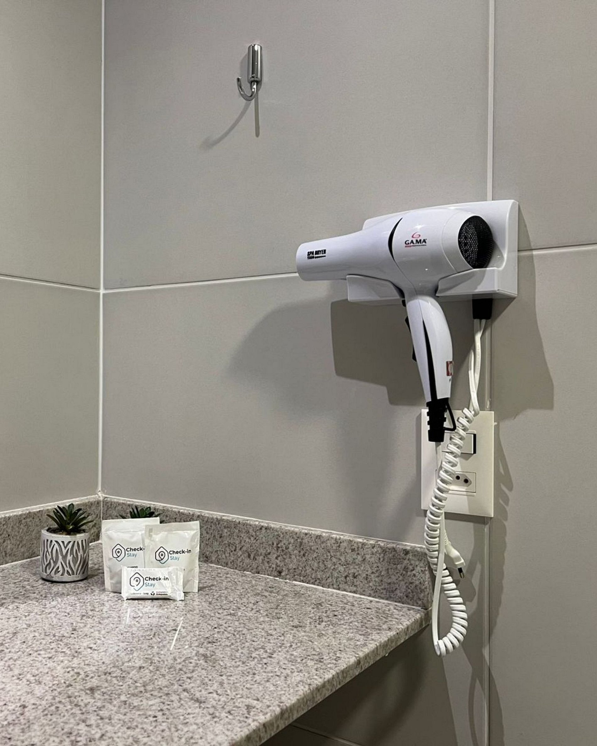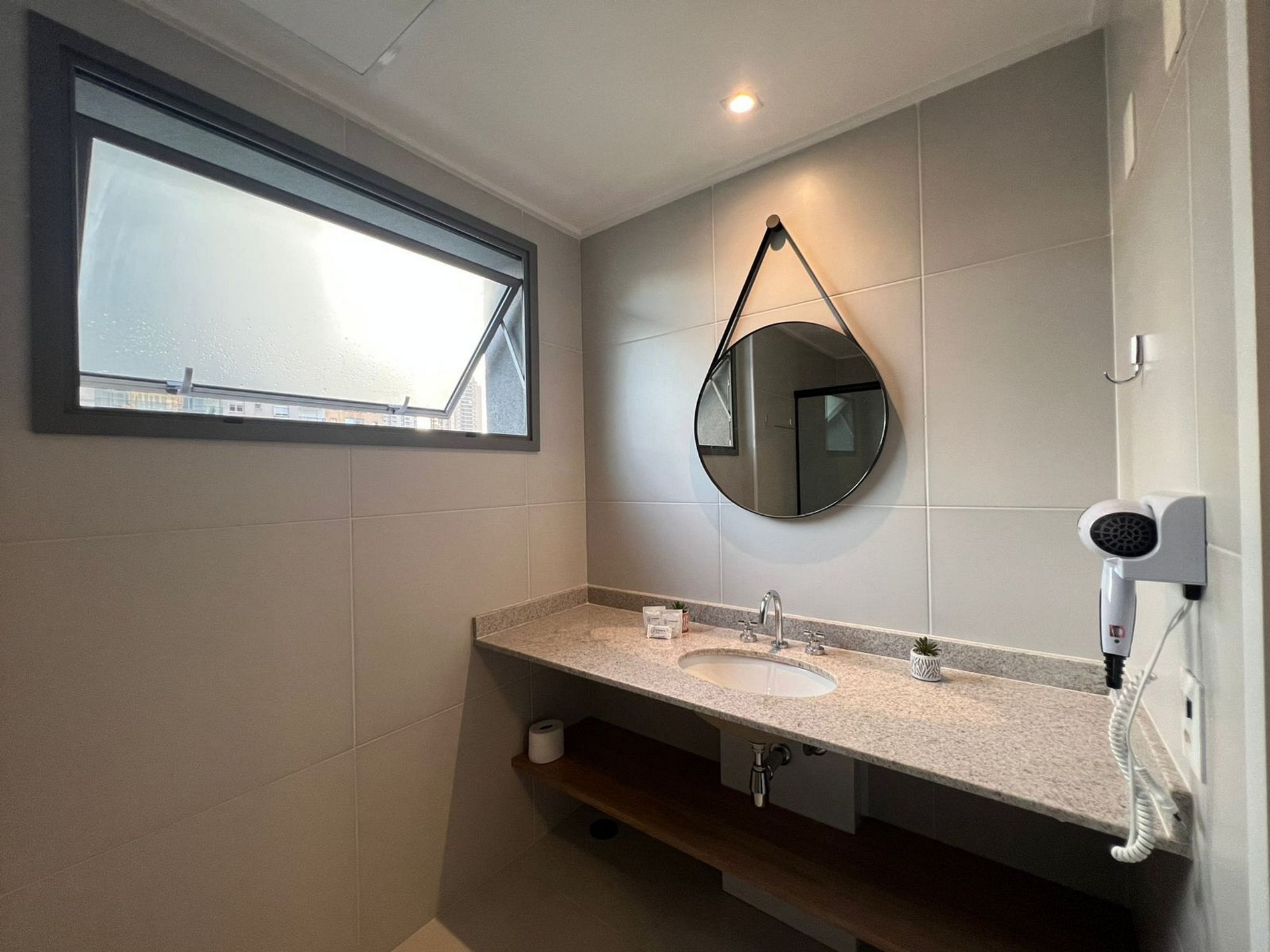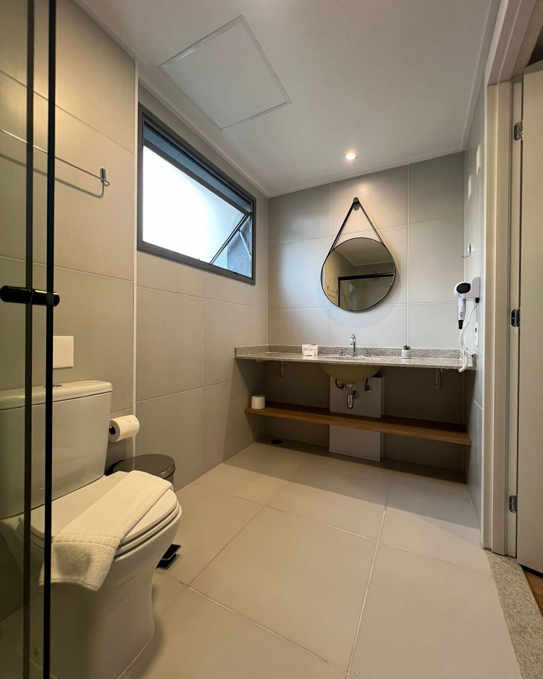 Banheiro espaçoso com secador de cabelo