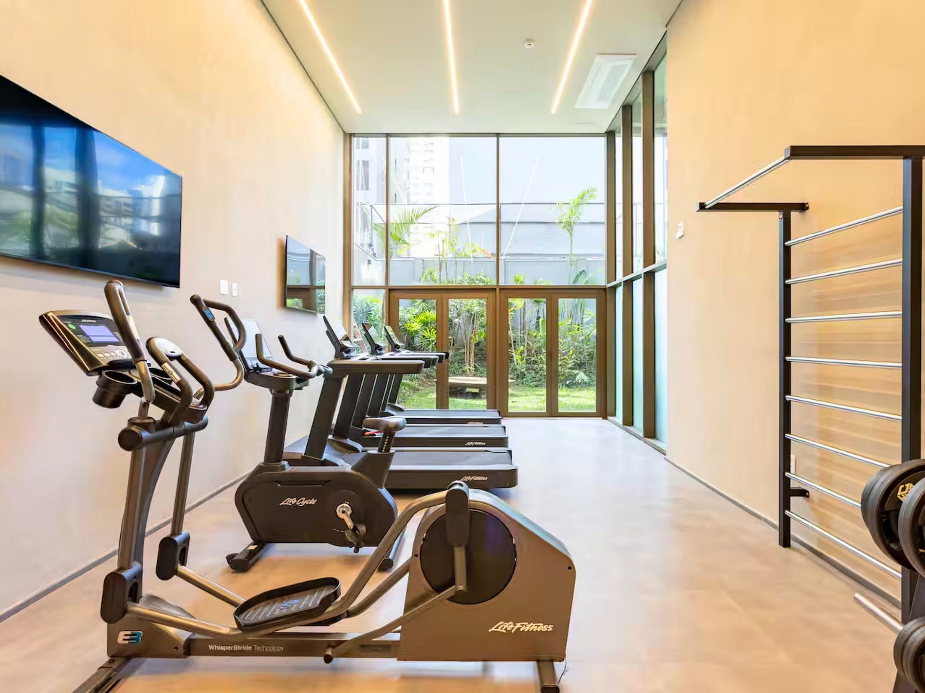 • Academia completa – espaço moderno, arejado e com vista para o jardim, perfeito para manter sua rotina de exercícios sem sair de casa.